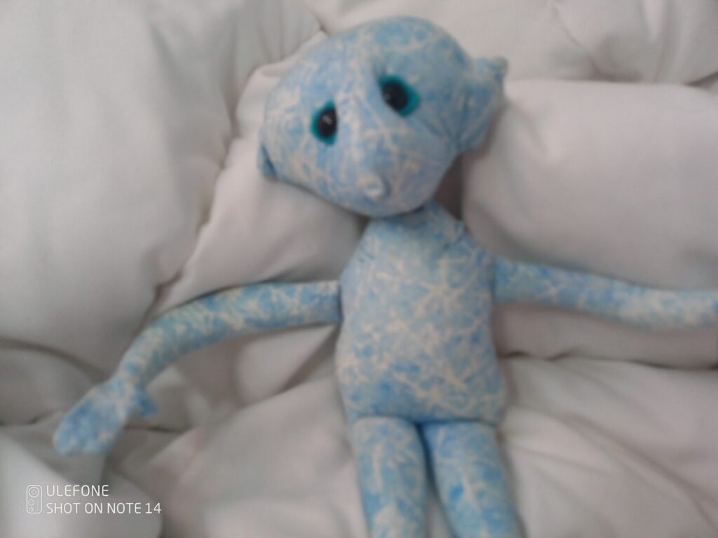 A few years ago I took several online courses. One was doll-making and another was creative writing. Though I knew how to sew, one of the dolls, made out of blue scrap fabric, had several mistakes and repairs. The head was lopsided with a seam in an odd spot, the limbs were very thin and weak looking and somehow he ended up having flat fin-like hands but with a thumb. This kid had character.
